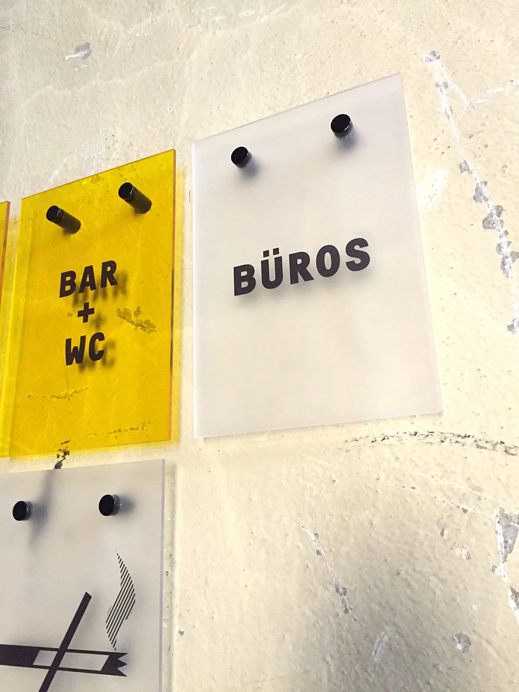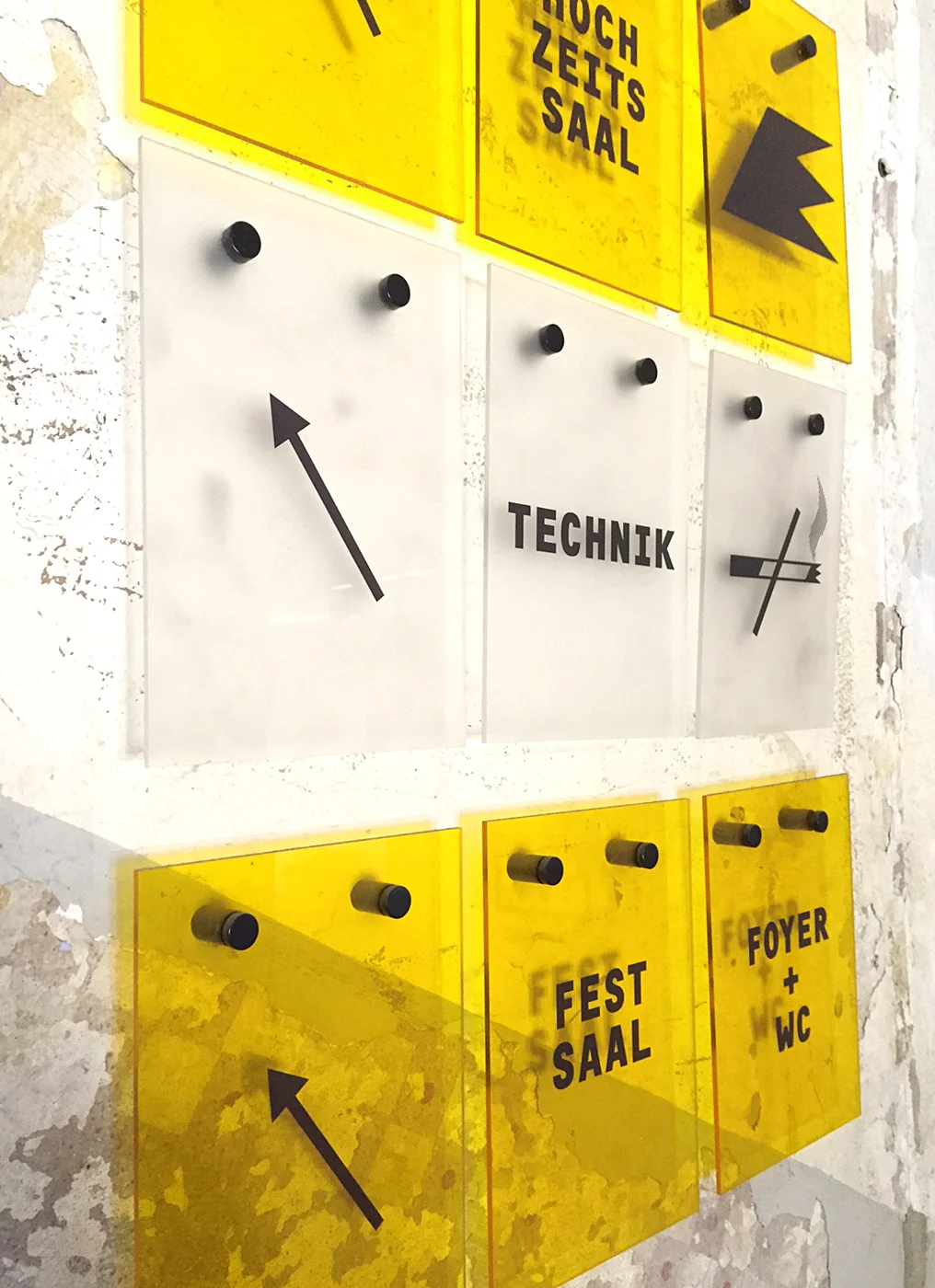 Das aus austauschbaren Platten bestehende, flexible Leitsystem sollte dem gleichen Prinzip folgen: Den heutigen Ansprüchen dienen und auffallen und dabei die Strukturen des Gebäudes respektieren.