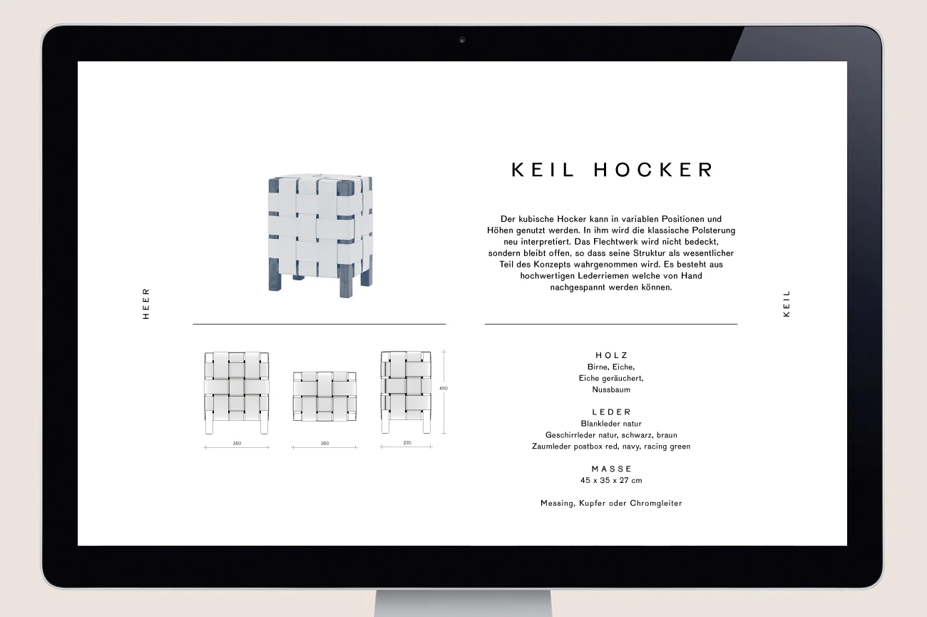 Info material for the Berlin based »Manufaktur HEER«. Internationally renowned Swiss Designer Daniel Heer designs and produces exclusive horse hair mattresses. Handmade furniture and leather accessories are also part of his collection, which he presents in his studio and showroom in Berlin Mitte.